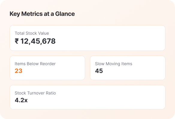 - Generate stock valuation, movement reports, slow- moving analysis, and profitability insights.